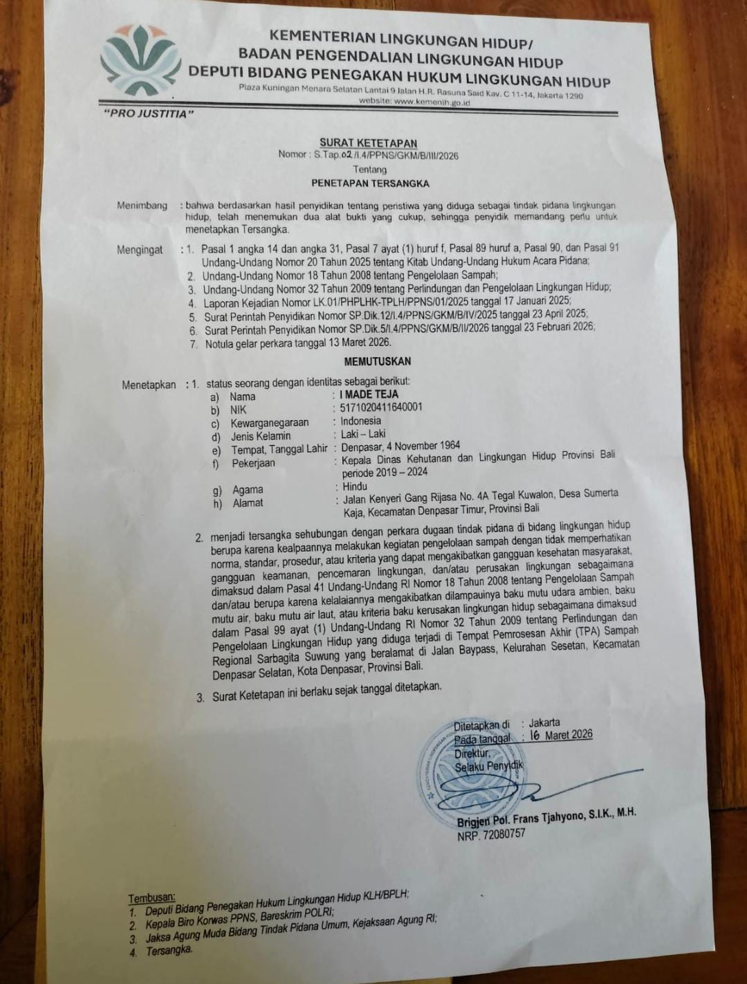 BALI, INFOTREN — Deputi Bidang Penegakan Hukum Kementerian Lingkungan Hidup/Badan Pengendalian Lingkungan Hidup menetapkan mantan Kepala Dinas Kehutanan dan Lingkungan Hidup Provinsi Bali periode 2019-2024, berinisial IMT, sebagai tersangka. Penetapan ini terkait dugaan kelalaian dalam pengelolaan sampah di Tempat Pemrosesan Akhir Regional Sarbagita Suwung, Denpasar Selatan.